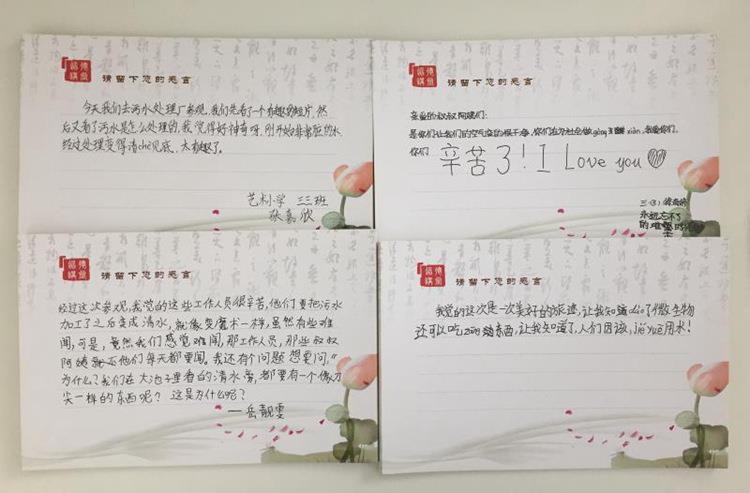 参观结束后,同学们纷纷写下自己的真切感受。先进的工艺和设备如同魔法棒,将恶臭不堪的污水经过处理变成了清澈透明毫无异味的生活用水,同学们充分感受到了科学带来的幸福生活;过滤的污水杂质让人咋舌,孩子们纷纷表示以后再也不往下水道里乱扔垃圾了,生活中更要节约用水,尽量减少污水量;看到每天都有大量的污水要处理,同学们也禁不住对这些勤劳朴实的工人叔叔阿姨肃然起敬,称呼他们是“水源的清洁工”。